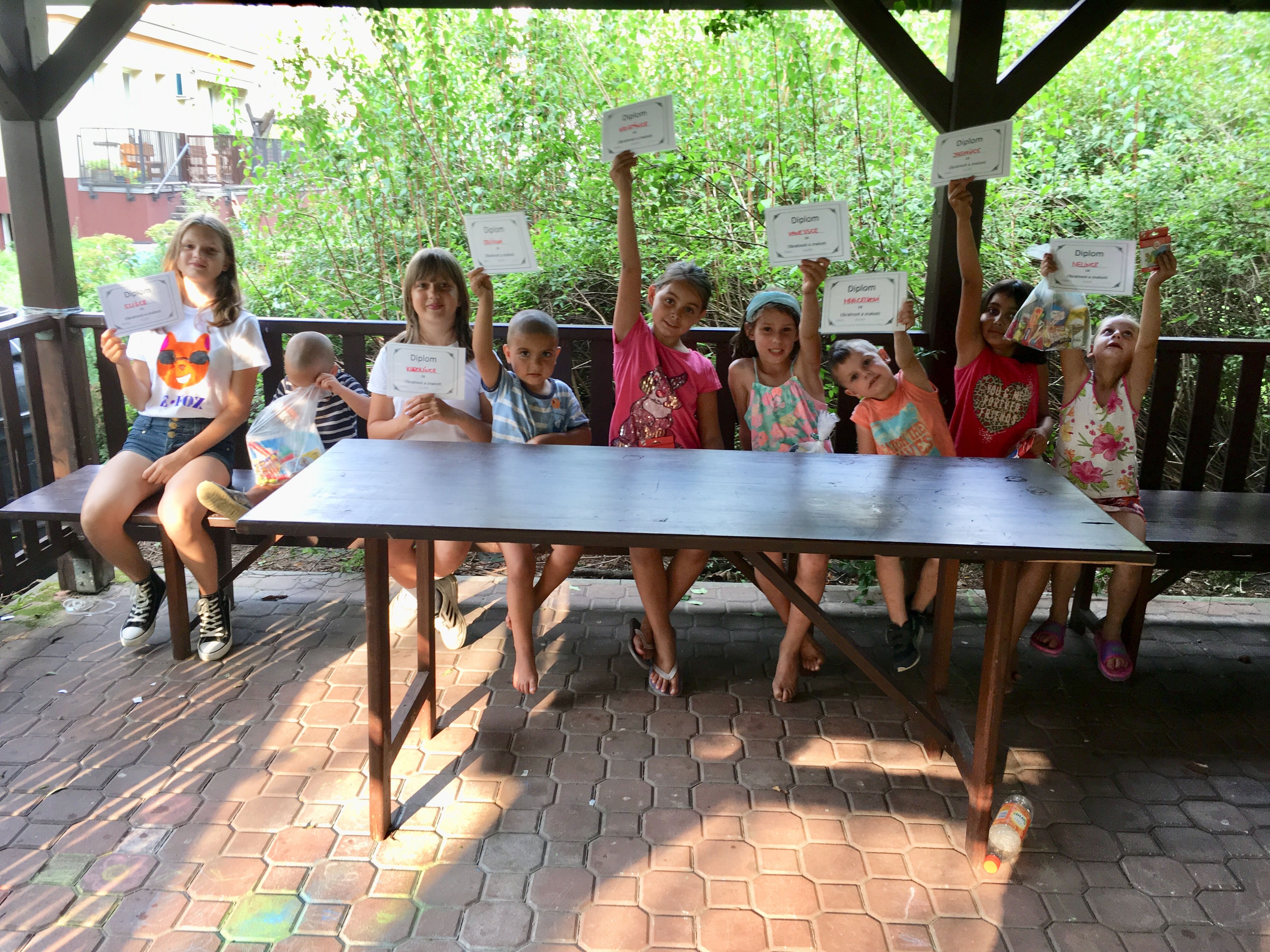 Děti z azylového domu se rozloučily s prázdninami společně, a to poslední prázdninový den v sobotu odpoledne. Pro děti byly na zahradě připraveny zábavné a vědomostní soutěže, sportovní hry. Děti se nadšeně zúčastnily všech nabízených aktivit a užily si společně slunečné odpoledne. Za účast na soutěžích a hrách dostaly diplomy a dárkové balíčky. Po aktivní části ještě následovalo skládání papírových čepiček a letadel, a pak již společné posezení a grilování s rodiči v zahradním altánku.