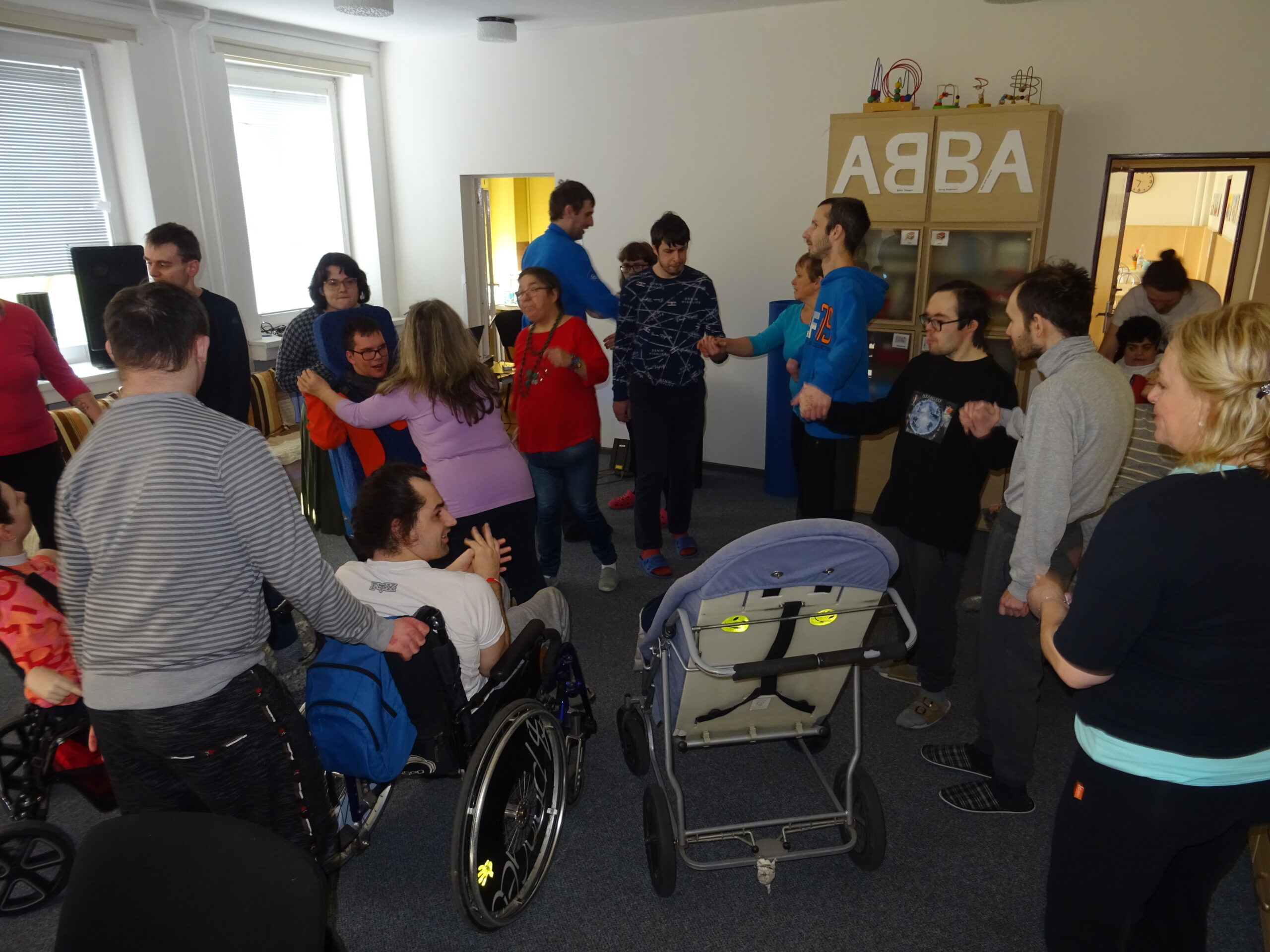 Pan Kresta v roli DJ dovezl hudební aparaturu s mnoha světelnými efekty. Hudba skupiny ABBA nás provázela celé dopoledne, všichni klienti se zapojili do poslechu, velká část i k tanci, někteří se učili i skupinový tanec pod vedením Renáty a Lenky.