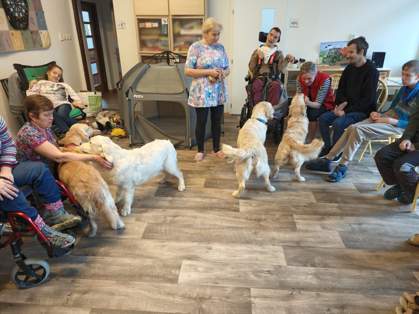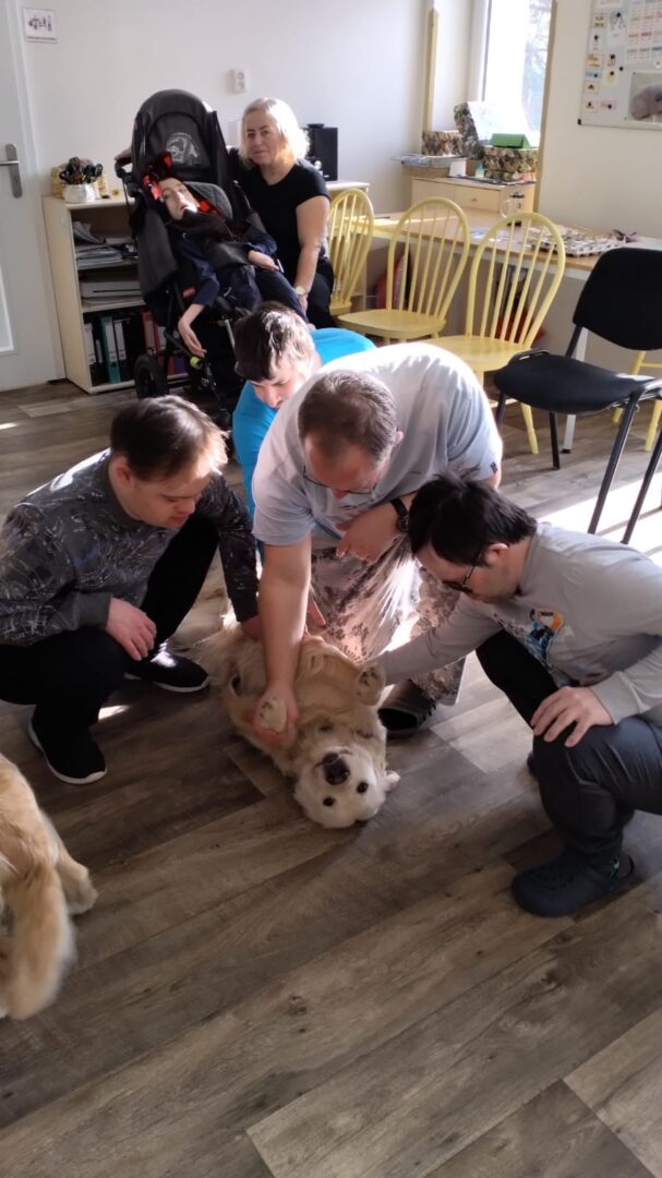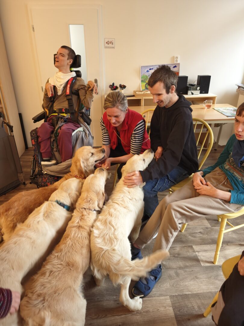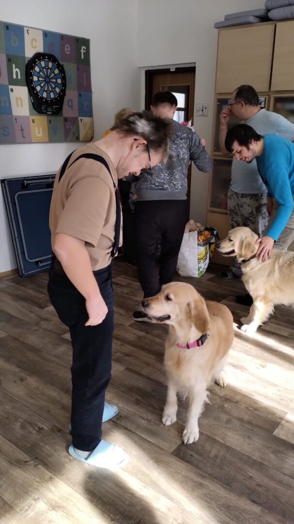 Během setkání pejsci předvádějí řadu dovedností – vyhledávají plyšové hračky i piškoty, aportují a spolu s klienty trénují základní práci se psem. Klienti se učí, jak psa správně chválit, jak ho vodit na vodítku a jak s ním bezpečně navazovat kontakt. Samozřejmostí je i možnost mazlení a přímého kontaktu – pejsci se ochotně položí k ležícím klientům a přirozeně navazují blízký kontakt.
