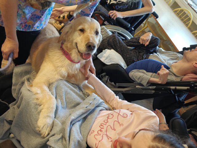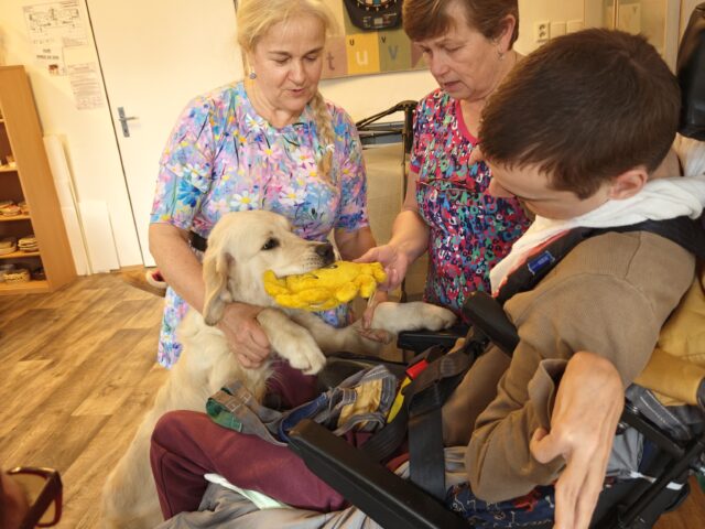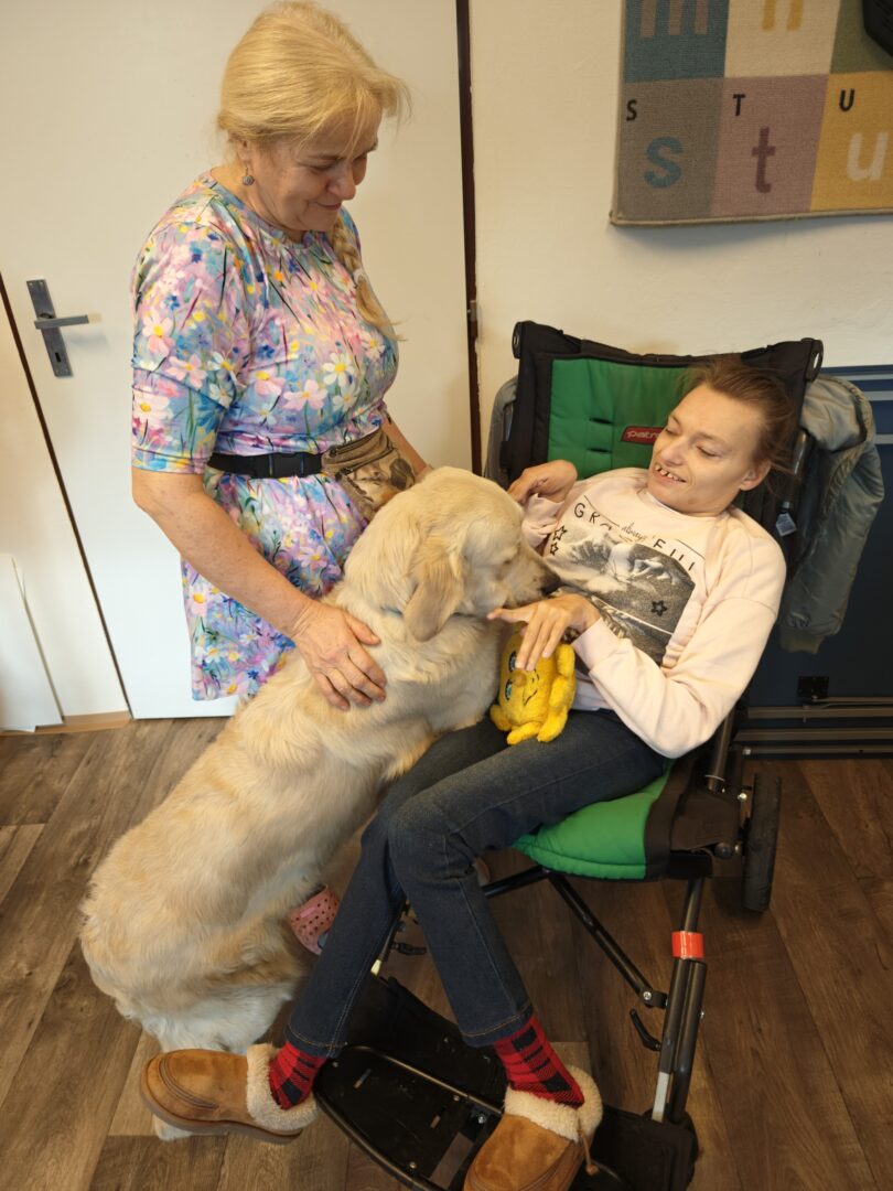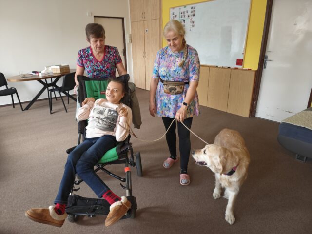 Pravidelně nás navštěvuje paní Ivana Kučerová se svými zlatými retrívry. Do stacionáře k nám docházejí canisterapeutičtí psi Jenifer, Direkt, Ginger a Ivanka. Měli jsme také možnost přivítat štěně Karamelku, která se na svou budoucí roli canisterapeutického psa teprve připravuje.