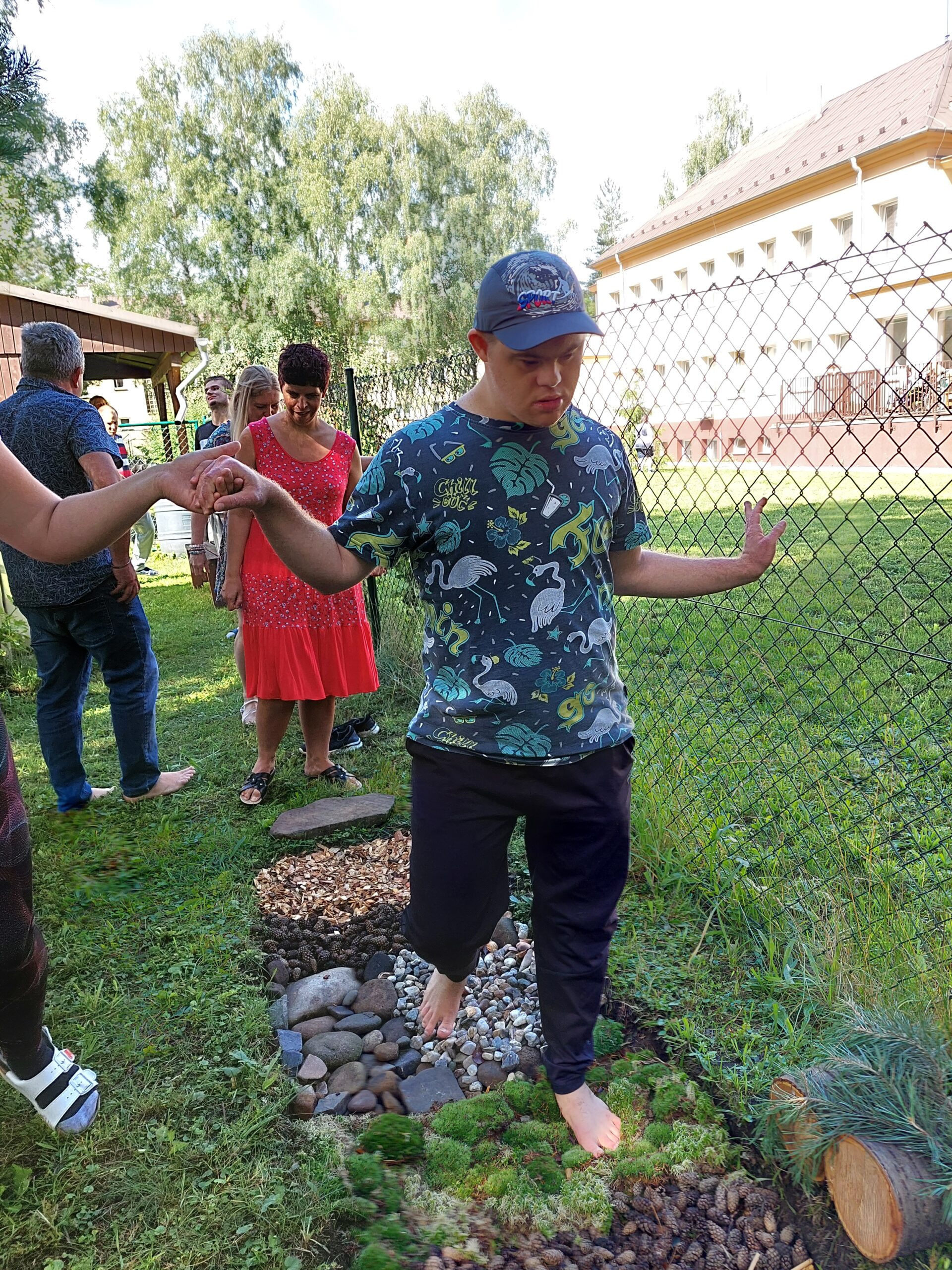 Pak už jsme začali díru zaplňovat postupně různými přírodninami, které jsme sami nasbírali, třeba šiškami, kameny, kamínky, senem, pískem, mechem apod. Pak už nezbývalo nic jiného, než chodníček vyzkoušet. Jeho otevření, které proběhlo dne 02. 08. 2023, jsme pojali slavnostně, pozvání přijal p. ředitel i p. vedoucí. V rámci aktivity „Prostřeno“ se uvařila zeleninová polévka, do které se použily naše produkty ze skleníku. Po otestování chodníku jsme si na polévce všichni pochutnali.
