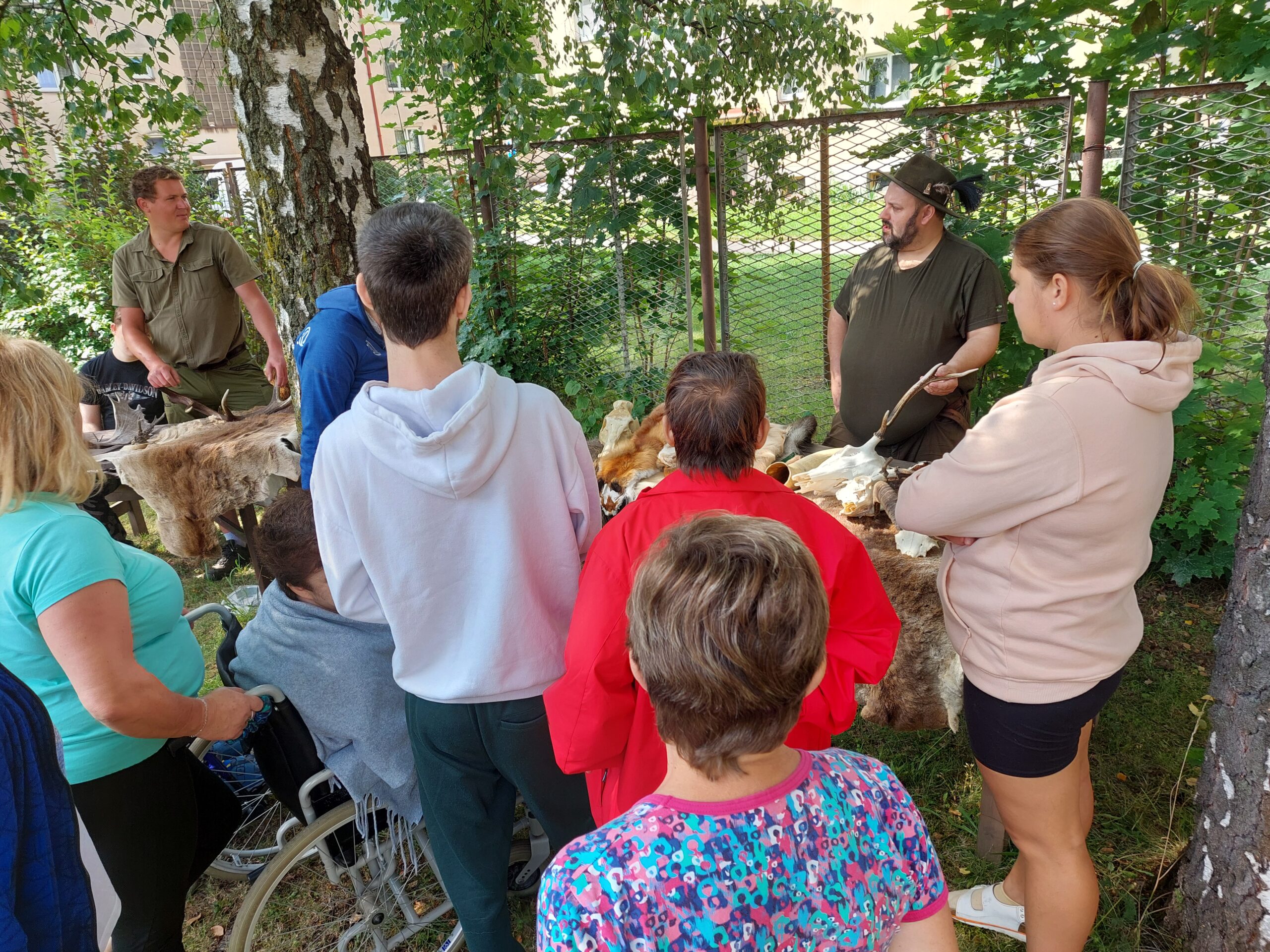 Zajímavé dopoledne jsme prožili 25. července 2024 na naší zahradě se čtyřmi členy Lesní správy Jablunkov. Přijeli nám povyprávět něco o myslivosti. Dovezli sebou svého psa, kůže lesních zvířat, lebky, parůžky a další zajímavé věci. Také sebou měli puzzle s lesní tématikou, které jsme mohli skládat na suchý zip a plátno s velkým stromem, kde jsme přilepovali obrázky zvířat.
