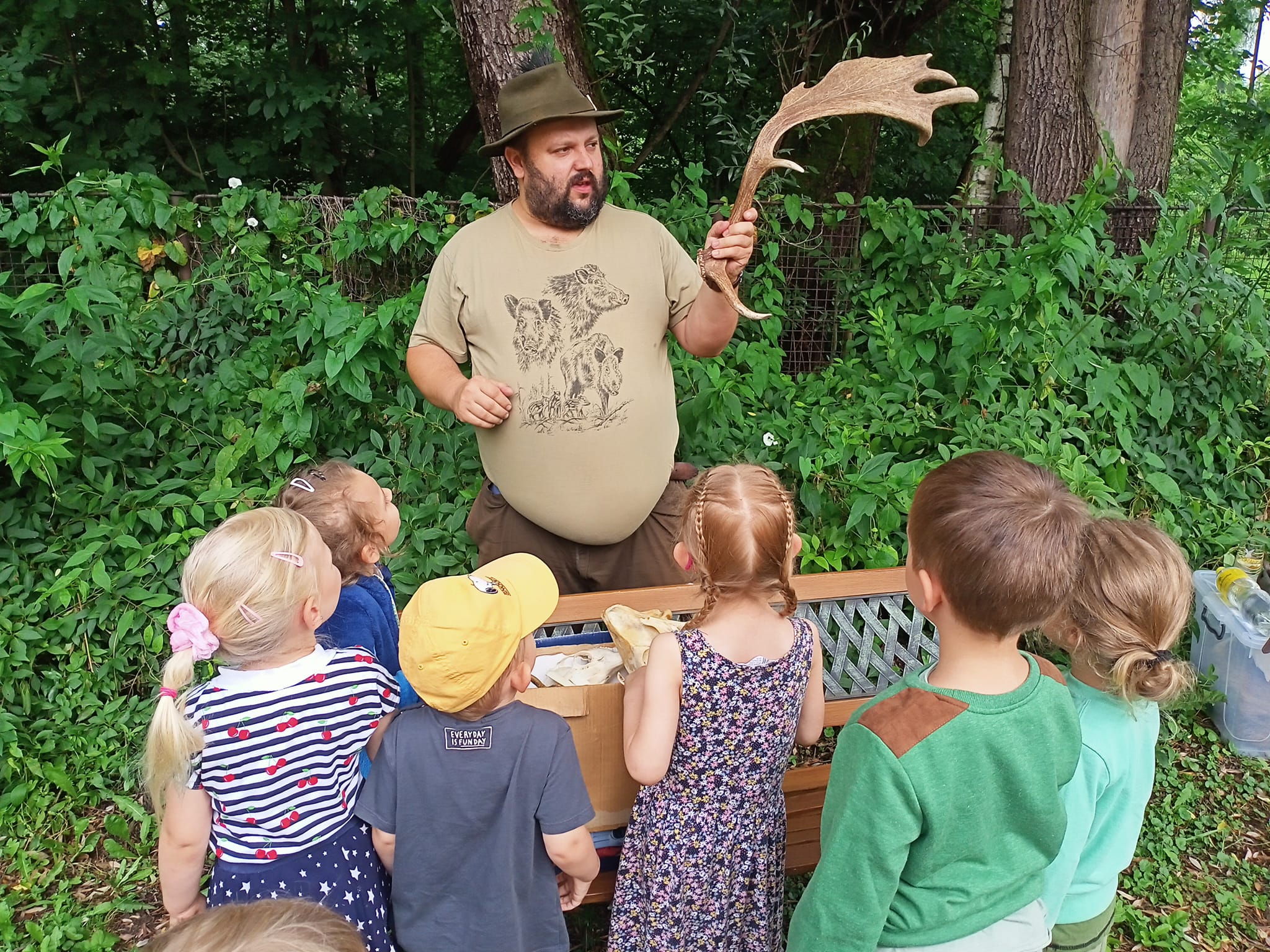 O prázdninách jsme se opět po roce setkali s odborníky z našich lesů. Toto zážitkové dopoledne umožnilo zapojit všechny naše smysly neboť jsme měli možnost šáhnout si na vycpané dravce, pohladit kožešiny zvířat, které můžeme potkat v našich lesích a přivonět si k plodům lesa a nebo poslechnout si jak zní troubení „vábení jelena“. Děkujeme Lesní správě Jablunkov- Lesy ČR, konkrétně paní Bc. Věře Kohutové za zprostředkování úžasných zážitků a pánům myslivcům za praktické ukázky a návštěvu pejsků!