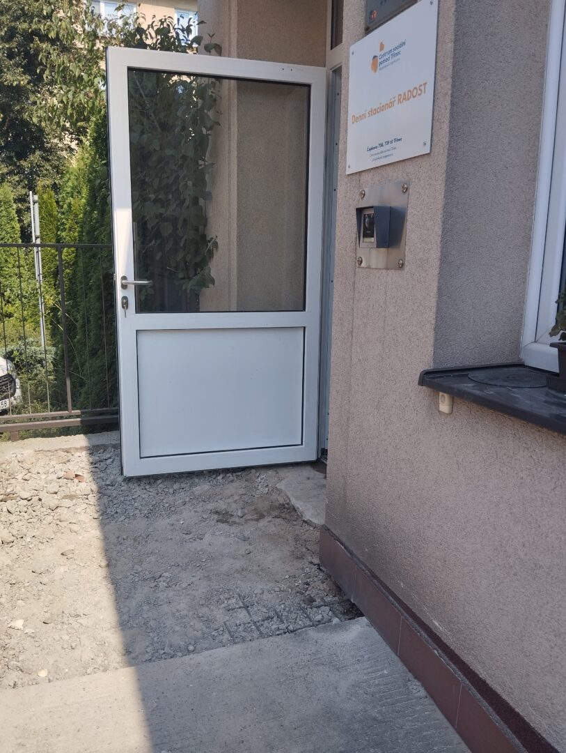 Účelem projektu bylo zkvalitnění vstupu/vjezdu pro imobilní klienty do Denního stacionáře RADOST, a zvýšení dostupnosti přilehlých dvou venkovních teras. Předchozí stav vstupu/vjezdu do stacionáře neodpovídal skutečným potřebám imobilních klientů, jelikož při přejezdu vstupními dveřmi bylo potřeba překonat menší kovový práh – rám zapuštěných vstupních dveří. Rovněž vstup na venkovní terasy představoval překonání 11 cm překážky.