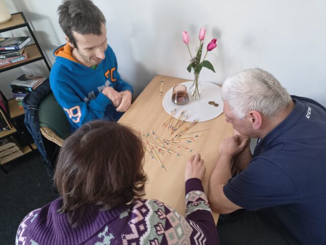 V informačním centru jsme si prohlédli stálou expozici a obdivovali tvořivé aktivity připravené pro děti – například výrobu tulipánů z pistáciových slupek či záložek z ubrousků. Naši klienti se tentokrát do tvoření nezapojili, využili však čas podle svého – někdo si zahrál společenské hry, jiní pozorovali práci dětí nebo si v klidu prohlíželi expozici.