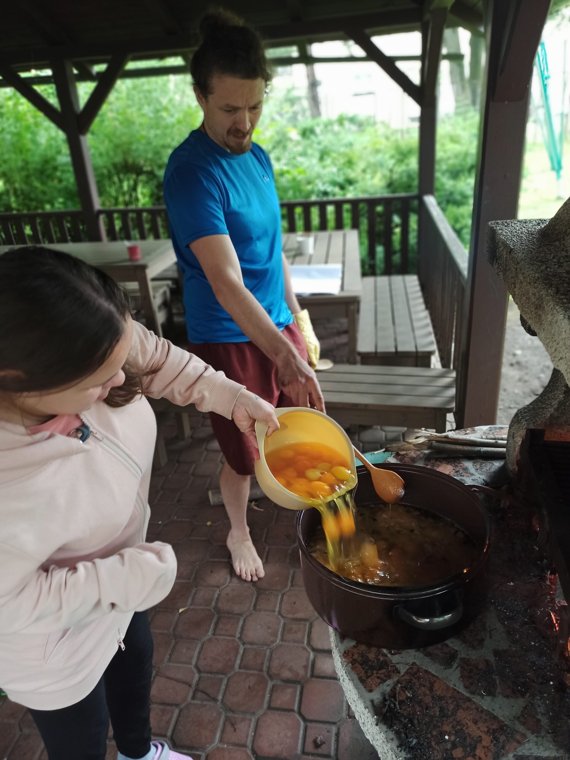 Jako každý rok se společně s klienty dělala vaječina, ale tentokrát jsme na společnou vaječinu pozvali i děti a pracovníky Denního stacionáře PAPRSEK. Vaječina se připravovala v krbu v zahradním altánku, a to ve čtvrtek dopoledne 29.6.2023. Do společné práce se zapojili hlavně klienti Denního stacionáře RADOST. Počasí sice nebylo ideální, ale my jsme si to užili. Na vaječinu jsme spotřebovali 95 vajíček. Během čekání na vaječinu jsme si společný čas zpestřili hudbou, u které si naši klienti zatančili společně s dětmi z DS PAPRSEK. K ohni patří i kytara, a tak jsme si po tanci i zazpívali. Vaječina všem moc chutnala.