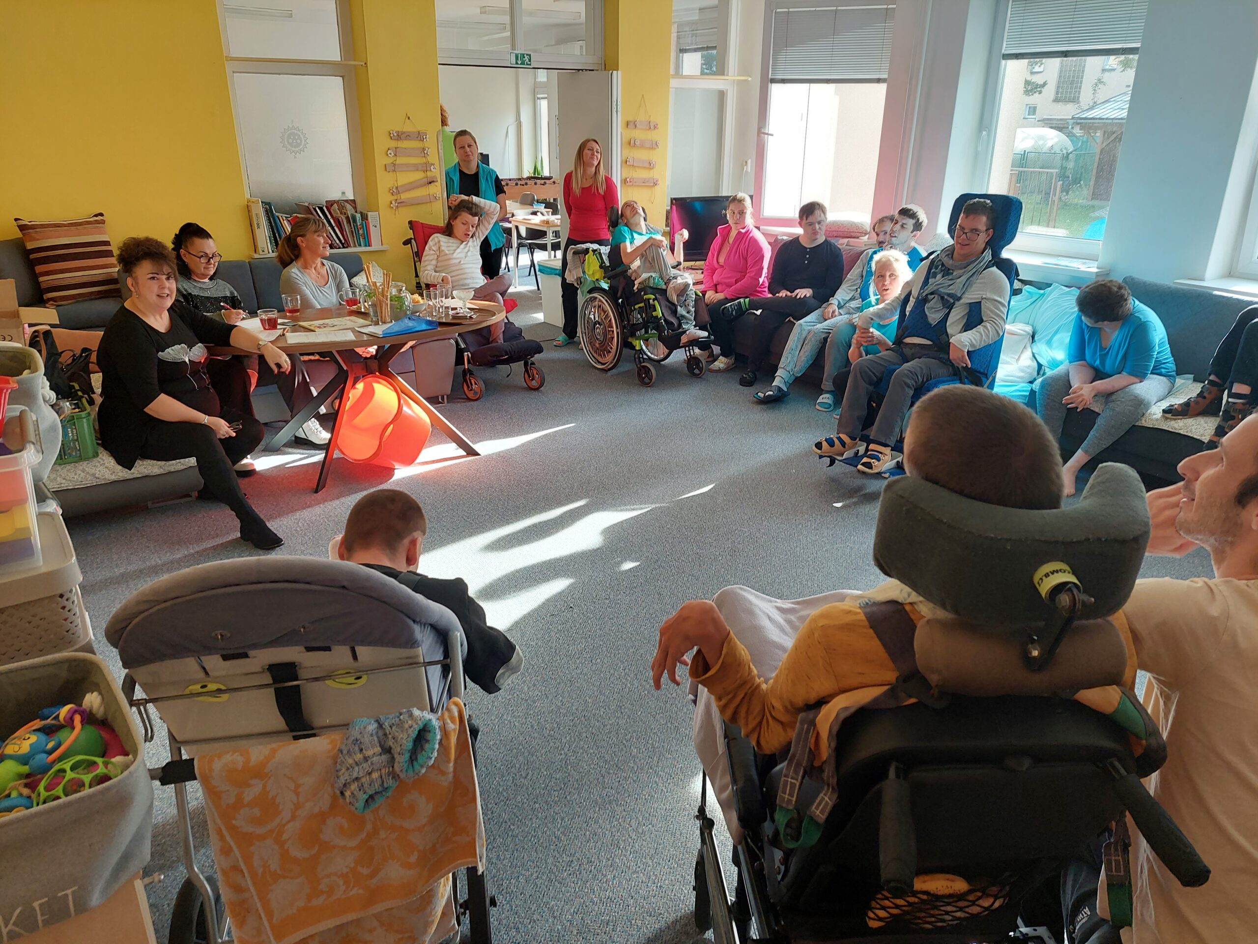 Dne 17. 10. jsme měli parádní dopoledne. Navštívil nás Evropský spolek pro OZP a připravil úžasné dopoledne plné pohádek, sportu a pohody. Klienti byli rozděleni do třech skupin a trochu si zasoutěžili. Každá skupina plnila úkoly a sbírala body. Úkoly nebyly jen sportovní, ale některé byly pohádkové, např. hádání filmových hlášek apod. Po celou dobu byla skvělá nálada, tančilo se a smálo. Po vyhodnocení bodů dostali všichni klienti diplomy společně se sladkou odměnou.