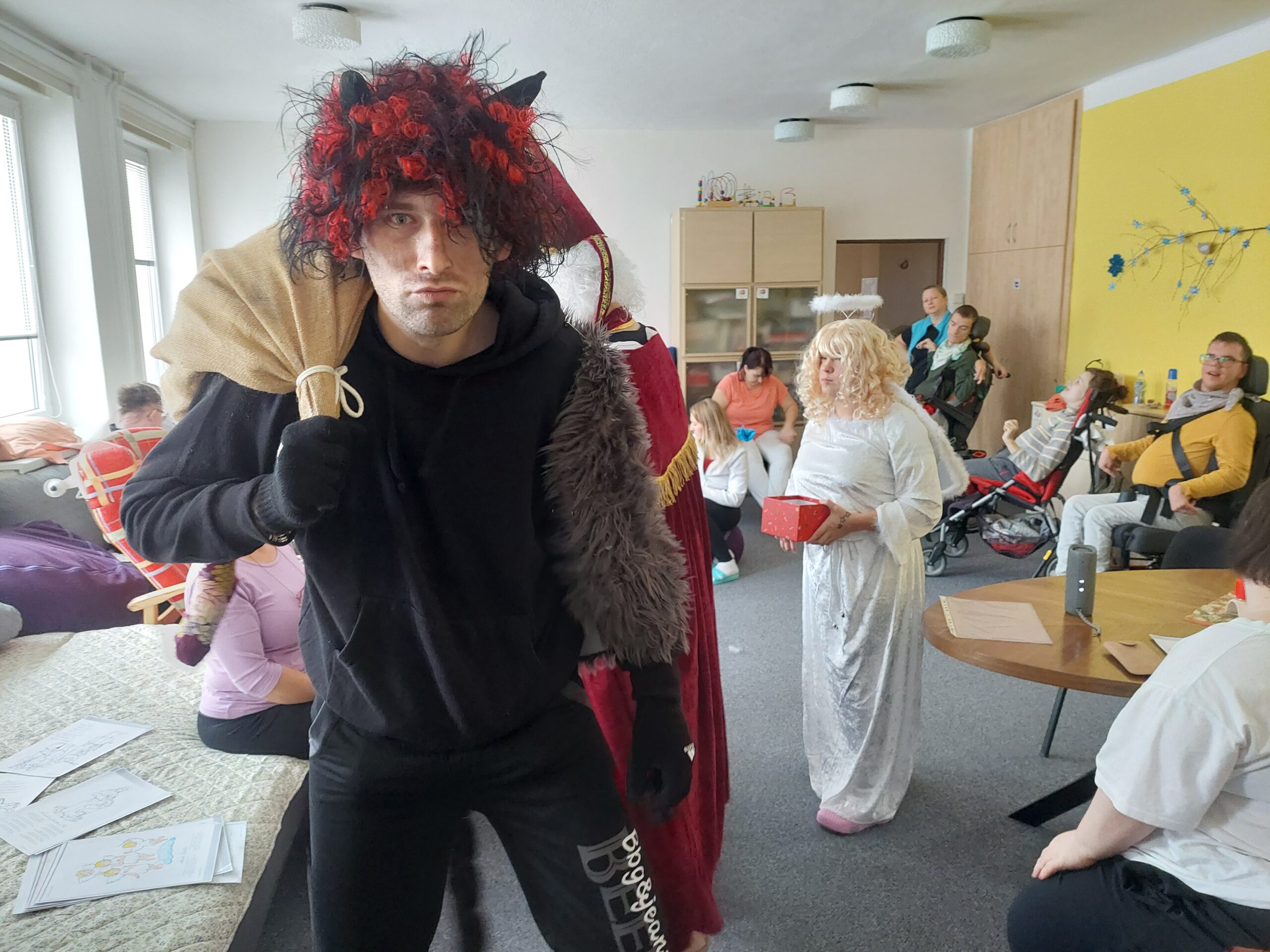 Klienti klientům opět připravili nečekané překvapení. Čtvrtek 7.12.2023 měl být obyčejným dnem, ale nebyl. Tohoto dne skupinka tří klientů společně s pracovníkem připravili velké překvapení. Kolem půl 11 nečekaně vtrhlo nějaké černé stvoření do stacionáře a začalo běhat mezi klienty a pracovníky. Nikdo nevěděl, co se děje. Potom vstoupil anděl a Mikuláš. A všem bylo jasné, že taky v tomto roce nás navštívil Mikuláš a jeho pomocníci. Čert byl na začátku trochu nervózni a chtěl s sebou vzít někoho do pekla, ale klienti a pracovníci byli připravení. Zapívali písničku a čert se uklidnil. Poté všichni se s Mikulášem, andělem a čertem vyfotili a nečekaná návštěva odešla o dům dál….
